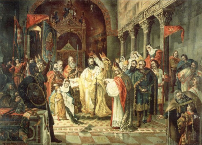 Prije 950 godina papa Grgur VII. (1073.-1085.) posebnim žarom je radio kako bi oslobodio kršćanski svijet od tolikih zala, a narodima povratio pravdu, mir i ljubav. On je u jesen 1075. godine, piše dr. fra Dominik Mandić, poslao u Hrvatsku svoga poslanika, nadbiskupa Girarda, koji je u studenom održao sastanak biskupa splitske nadbiskupije. Pod predsjedanjem Papinih poslanika crkveni sabor otpočeo je svoja vijećanja u Splitu početkom listopada 1076. Usporedo s tim i hrvatski velikaši s narodom saborovali su na solinskim poljima. Svi su na koncu, crkovnjaci i svjetovnjaci, složno i jednodušno izbrali za kralja Dmitra Zvonimira.