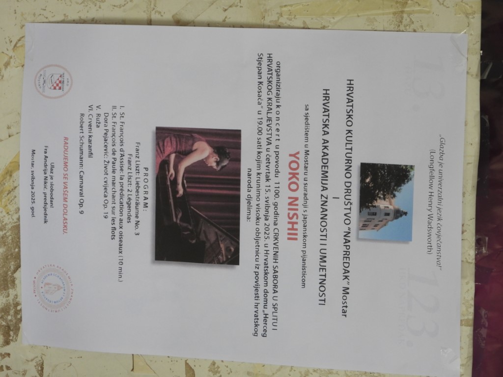 koncert u povodu 1100. godina CRKVENIH SABORA U SPLITU I HRVATSKOG KRALJEVSTVA u četvrtak 15. svibnja 2025. u Hrvatskom domu „Herceg Stjepan Kosača“ u 19.00 sati kojim krunimo visoku obljetnicu iz povijesti hrvatskog naroda djelima